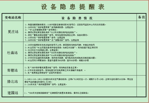 2.1 設(shè)備隱患提醒表:匯總變電站存在的異常信號,且在短時間內(nèi)無法處理的隱患(例如:滕北站發(fā)“216開關(guān)保護裝置異!卑l(fā)后隨即復(fù)歸,檢修部門無法捕捉檢查)。監(jiān)控值班員在監(jiān)控過程中,可以通過此表跟蹤并加強監(jiān)視,及時匯報,提高值班員的判斷能力。