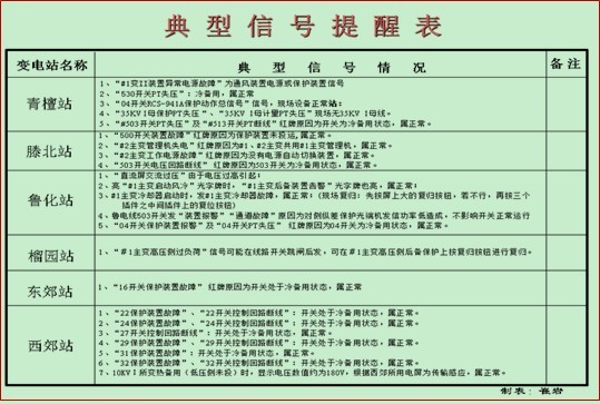 2.2 典型信號提醒表:此類信號并不是設(shè)備異常信息,但在工作中會時不時的發(fā)出,在判斷上容易產(chǎn)生誤導(dǎo),為了避免不必要的精力支出,我們將這類信號匯總提醒值班員。例如:220KV開關(guān)收發(fā)信機動作信號、備用開關(guān)的異常信號等都可以通過此表來排除,加強設(shè)備巡視與監(jiān)控質(zhì)量。